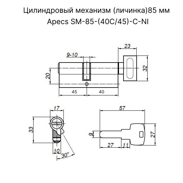 Цилиндровый механизм (личинка) 85 мм Apecs SM-85 (40C/45)-C-NI,с вертушком,никель