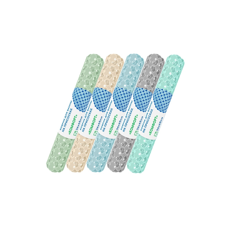 Название коврика «КОМФОРТ» говорит само за себя. На поверхности коврика расположены полые элементы- полусферы, служащие основой для присосок, очень прочно крепящихся к поверхности ванны. Благодаря этому рельефу коврик приобретает усиленный антискользящий эффект, не теряя при этом дренажных свойств.
