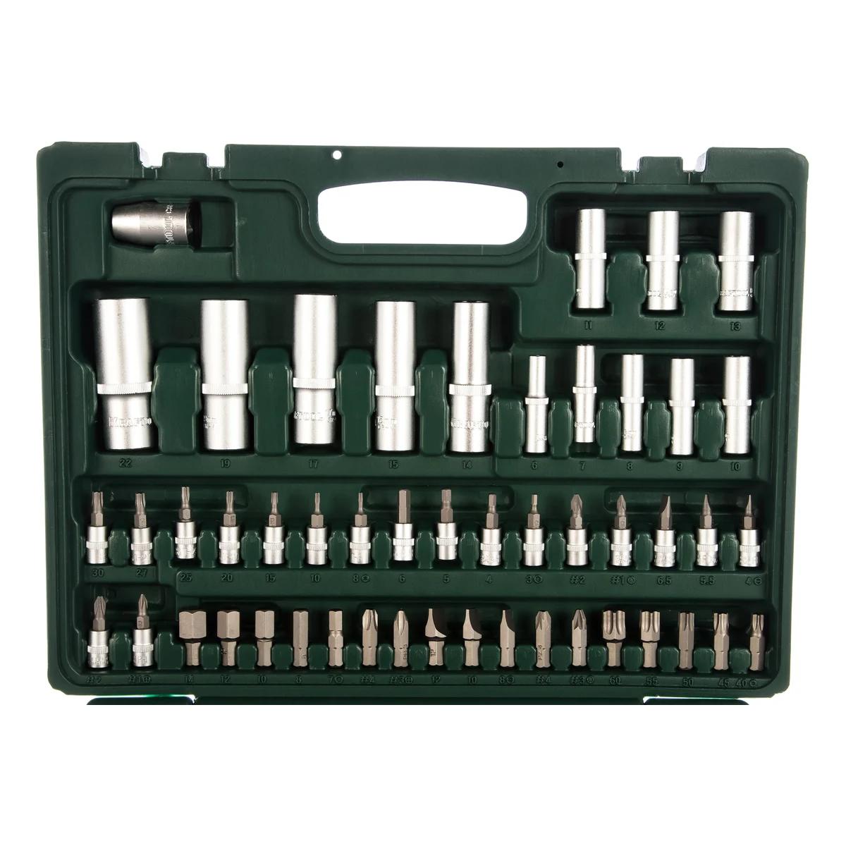 - Торцевые головки-биты 1/4" (РН 1; 2 ;PZ 1; 2; Torx: T 5; T 10; T 15; T 20; T 25; T 27; T 30; Hex 3; 4; 5; 6; SL 4; 5; 7) — 18 шт