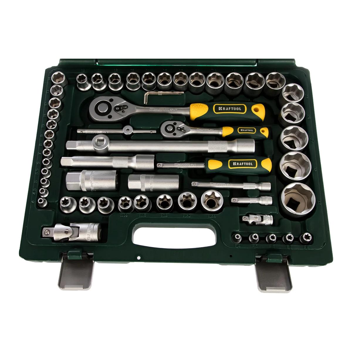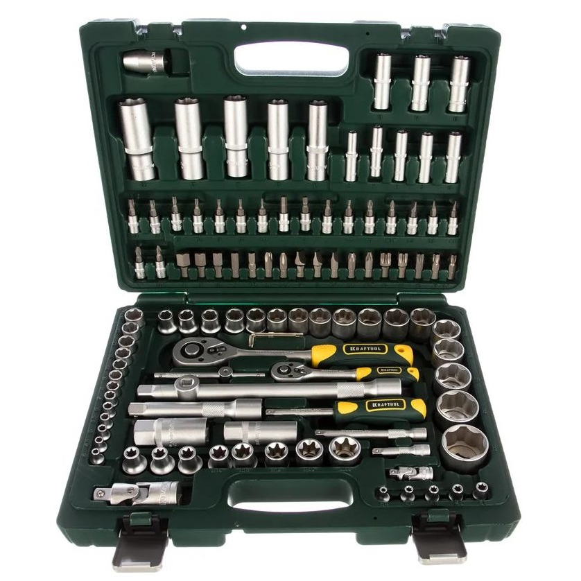 Набор инструмента универсальный Kraftool в пластиковом чемодане. Все элементы выполнены из хромованадиевой стали CrV. Универсальный набор подходит для ремонта машины, мотоцикла, велосипеда, а так же для широкого спектра работ в доме и на даче.