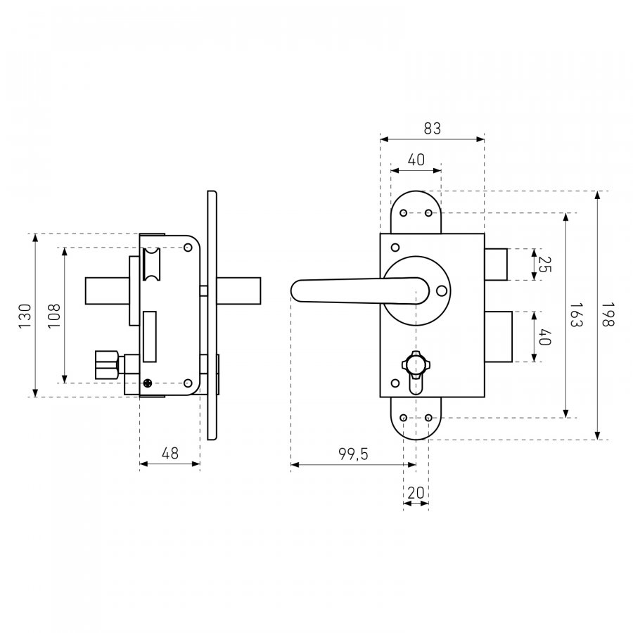 Замок накладной с ручками и цилиндровым механизмом. Предназначен для установки на деревянные и легкие металлические двери.