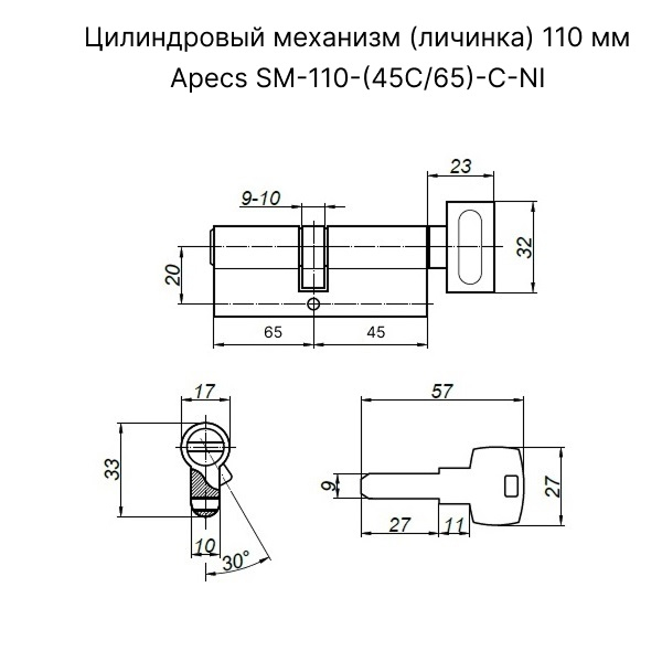 Цилиндровый механизм (личинка) 110 мм Apecs SM-110-(45С/65)-C-NI,с вертушком,никель