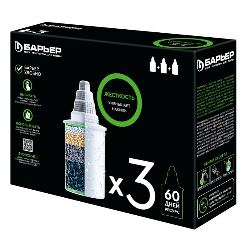 Комплект кассет к фильтрам-кувшинам для воды поможет убрать излишнюю жесткость. Дополнительной функцией элементов является удаление хлора и хлорорганики. В комплект входят 3 кассеты, каждая из которых имеет ресурс очистки до 350 литров.