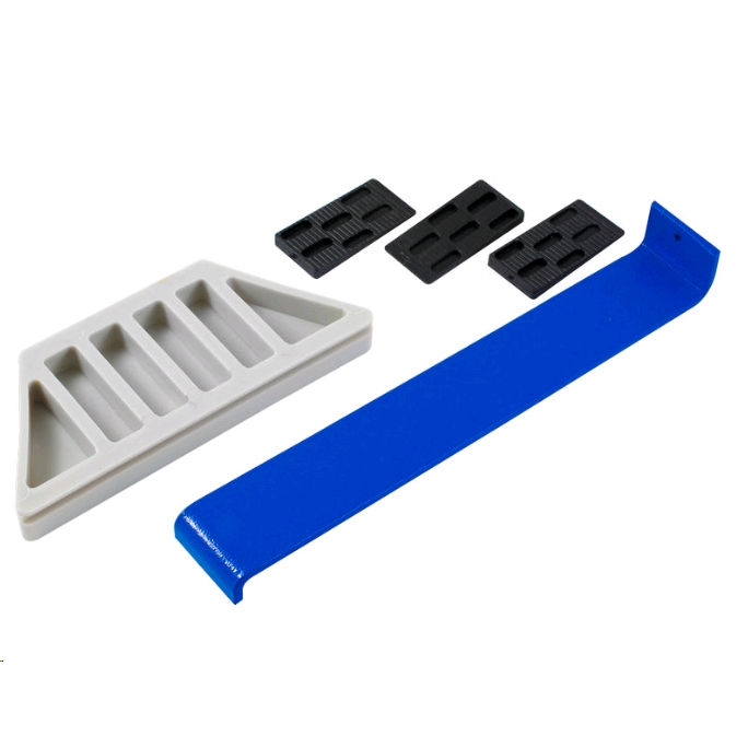 Набор инструмента для укладки ламината разработан для безопасной работы по укладке ламинатной доски. Клинья формируют отступ от стены, а специальная скоба упрощает укладку последней доски ламината, не повреждая замки и поверхность изделия.