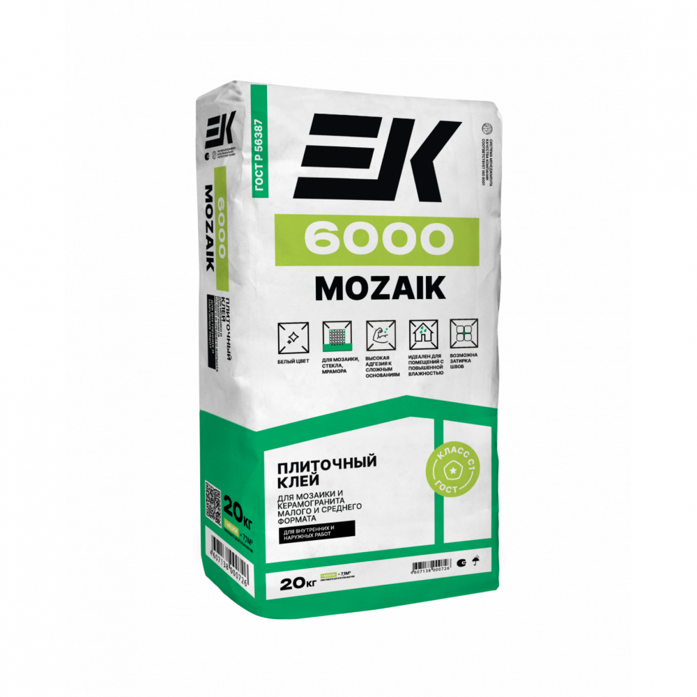 Клей ЕК 6000 Mozaik применяется для мозаики и керамогранита, плит из мрамора и других прозрачных и полупрозрачных материалов малого и среднего формата (до 45x45 см на стены, пол и 60х60 см на пол), стандартного и вытянутого формата (площадью до 2 025 см² на стены и 3 600 см² на пол) при условии нанесения клея комбинированным способом (клей нанести на основание и плитку). Клей пригоден для использования в системе «теплый пол».