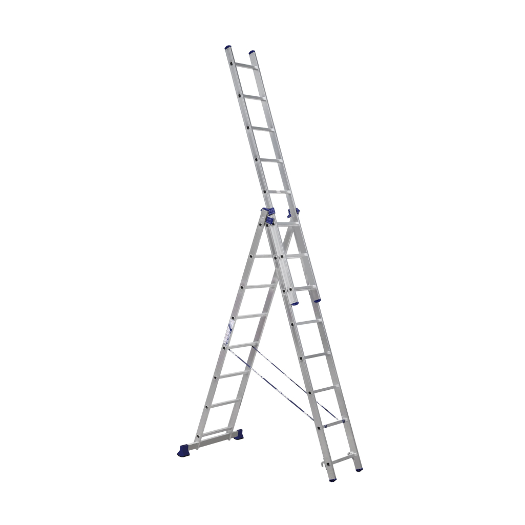 Универсальность данной лестницы заключается в том, что она может использоваться как раздвижная приставная лестница из трех частей и как свободностоящая стремянка (перевернутая русская буква «У»). Более того третья секция является съемной, и ею можно пользоваться отдельно как приставной лестницей, а оставшаяся часть при этом представляет двухсекционную универсальную лестницу. Эта лестница является по праву наиболее универсальной из всех лестниц, и несмотря на необходимый попарный перехлест секций как в конфигурации «приставная лестница» так и в конфигурации «стремянка», что усложняет, утяжеляет и поэтому удорожает ее, является самой популярной по продаваемости из-за своей исключительной универсальности.