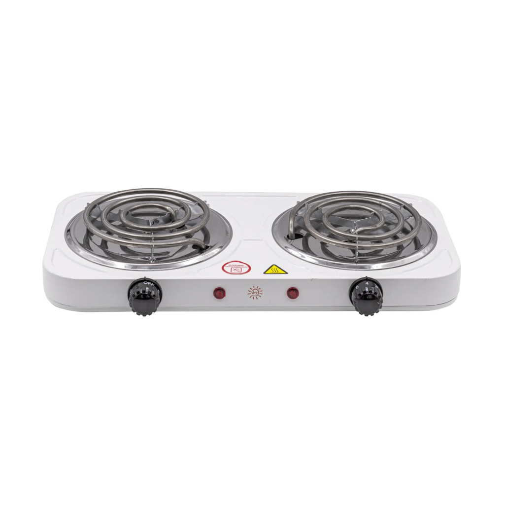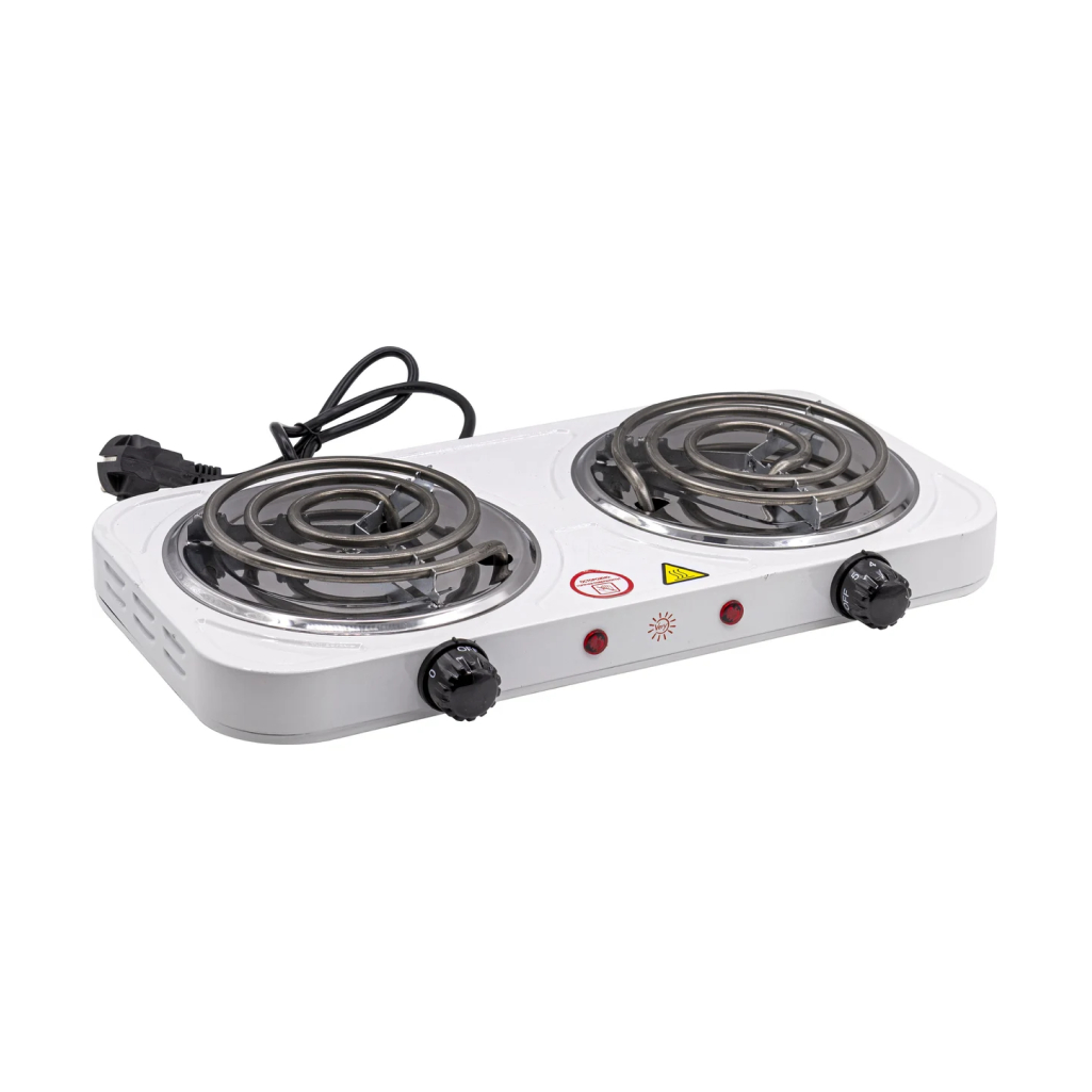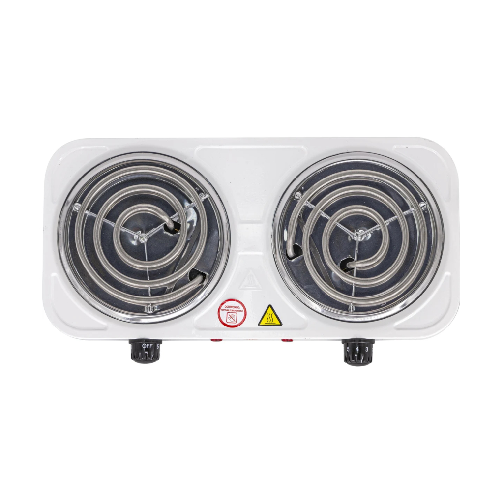Электрическая настольная плита с двумя спиральными конфорками и мощностью 2000 Вт. Корпус изготовлен из стали, покрыт эмалью, толщина покрытия 0,3 мм.