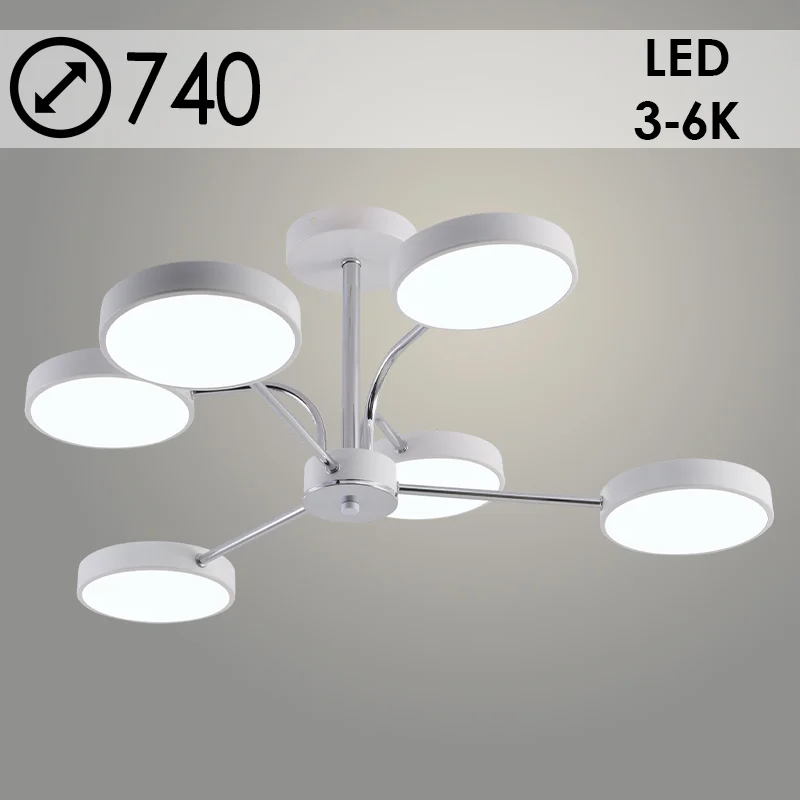 Люстра светодиодная может настраиваться как с помощью настенного выключателя, так и при помощи пульта управления. Он помогает менять цветовую температуру в диапазоне от 3000 до 6000 К, выбирая комфортный вариант.