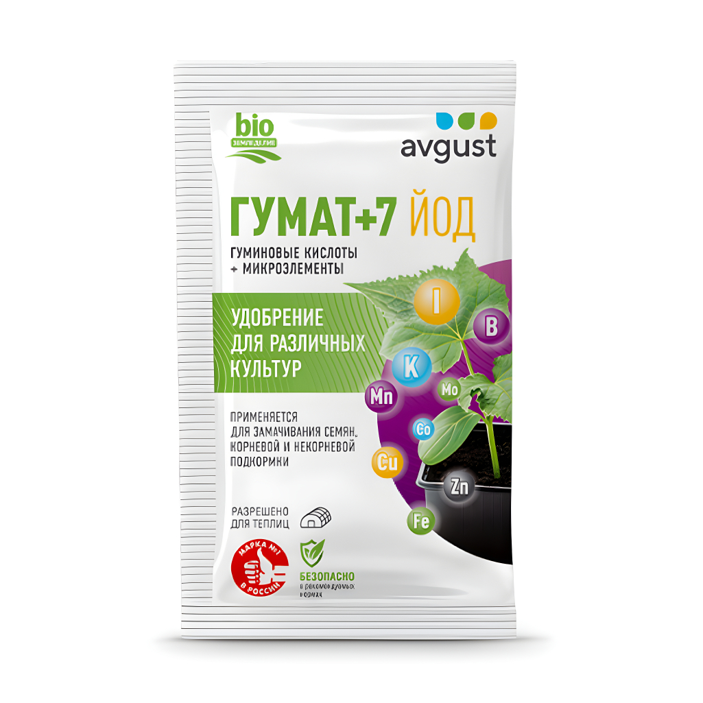 В удобрении Гумат +7 ЙОД семь минеральных добавок: азот, бор, цинк, марганец, молибден, железо. Семь микроэлементов сделали состав удобрения на основе гумата не только стимулятором роста, но и удобрением для почвы. Все эти минералы находятся в доступной для растений форме и легко поступают в клетки.