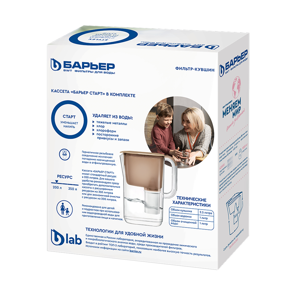 В комплекте с фильтром-кувшином кассета Барьер Жесткость для вкусной воды без накипи. Она значительно умягчает воду, очищает от хлора и хлорорганических соединений, тяжелых металлов и других вредных примесей. Удаляет посторонние привкусы и запахи, улучшает вкус воды. Ресурс — 350 литров.
