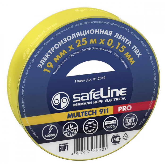 Изолента Safeline 19 мм 20 м, желтая