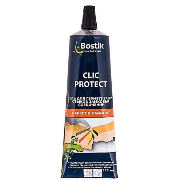 Прозрачный водостойкий гель для герметизации швов при укладке ламината и паркетной доски при монтаже покрытия плавающим способом. Обработанное Bostik CLIC PROTECT напольное покрытие можно разобрать без повреждений.