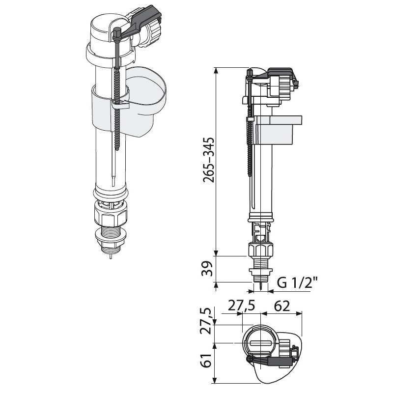 Клапан наполнения бачка унитаза с боковой подводкой воды нового поколения от чешского производителя ALCAPLAST. Подходит для большинства современных моделей керамических бачков унитазов.