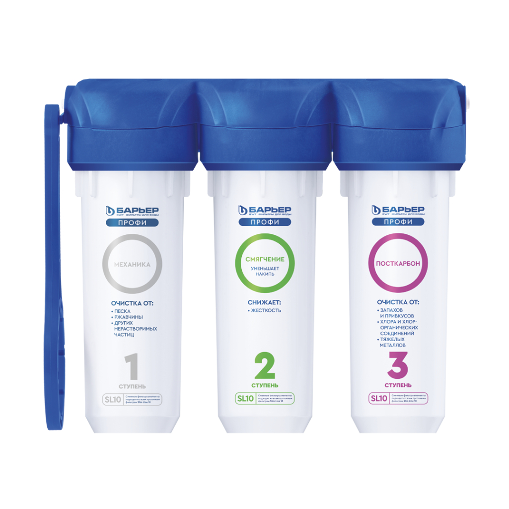 - "Барьер Профи ПостКарбон" - удаляет остаточный хлор и его побочные продукты, неприятные запахи и привкусы, кондиционирует воду