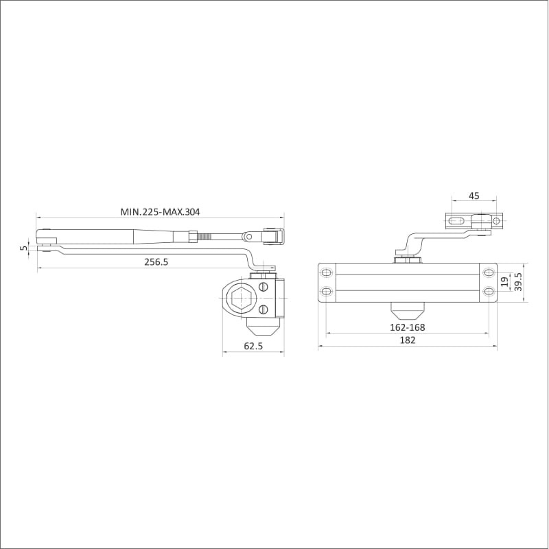 - Универсальный установочный размер в серии легких доводчиков ( 162-168 мм ) за счет овальных отверстий в корпусе.